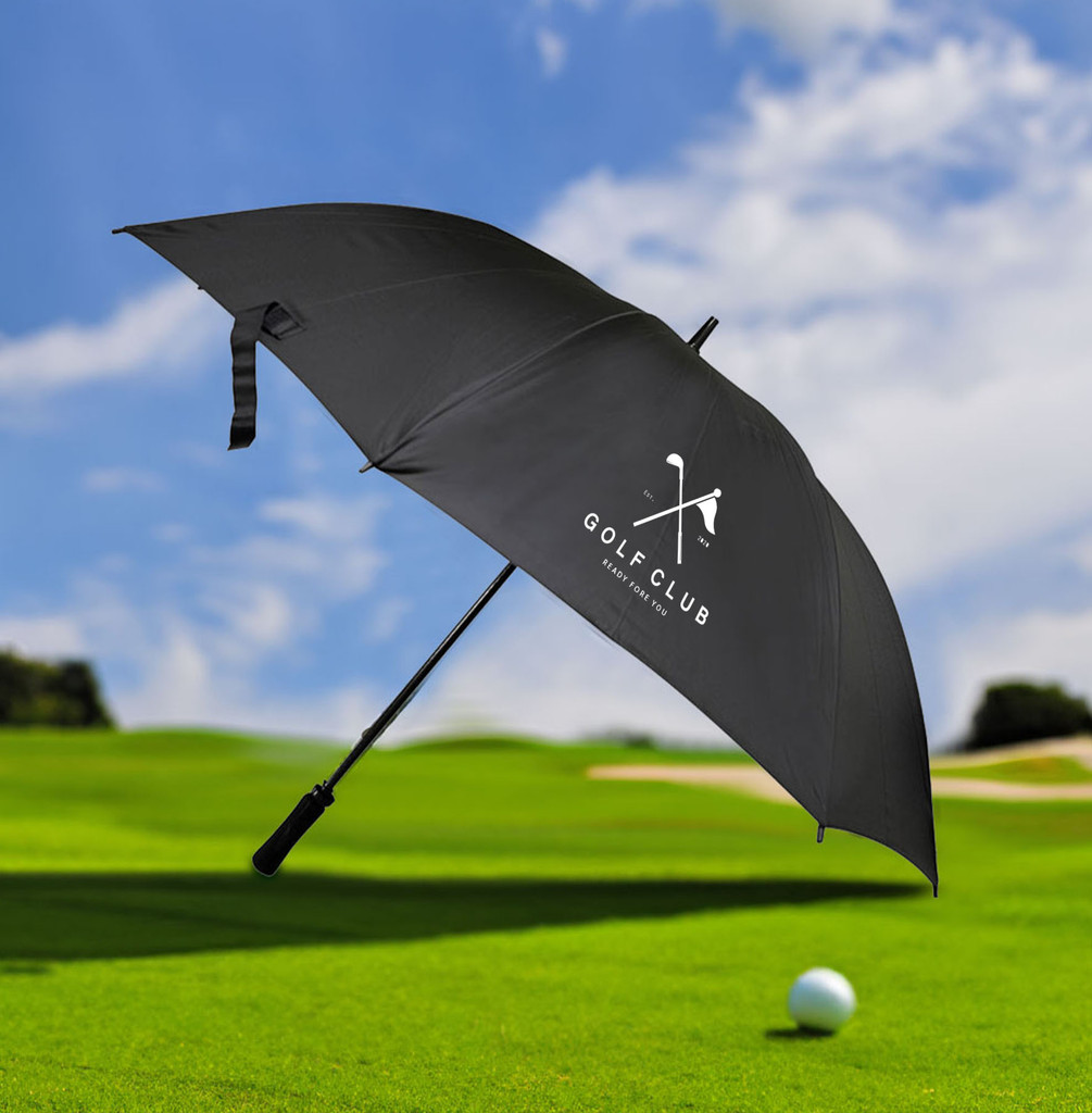 Golf umbrella with eight panels made from Pongee material. 14mm black fiberglass shaft and ribs. Manual open, plastic tip and metal top. Rubberized straight handle grip. Hook and loop fastener tie closure.