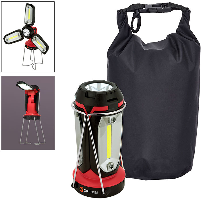 Flashlight Output: up to 120 Lumens Panel Output: up to 90 Lumens per COB panel, total of 270 Lumens Under Panel Output: up to 100 Lumens Bulb Type: 3W LED and COB Function button switches between 6 modes: high (front), low (front), strobe (front), high (panels), low (panels) and high (front & panels) Holding down the function button for 3 seconds activates the single under-panel worklight - 2 modes: high and low Adjustable tilt top and panel lights Magnetic base Fold-away handles convert to optional light stand Certifications: CE and ROHS Includes 3 x AA batteries and BG344 dry bag Packaged in a 4L dry bag (14"H x 5"W)