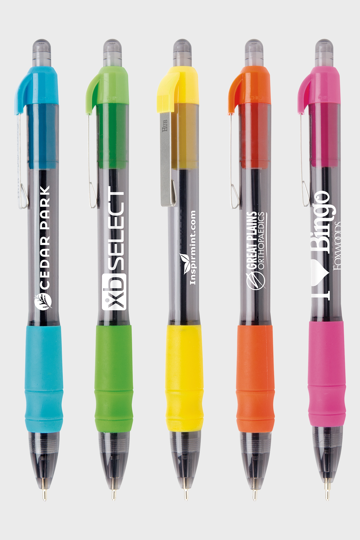 Click-action retractable ballpoint pen Air cushioned rubber grip that adds to writing ease Translucent black barrel contrasts with tropical trim colours Hub enjoy writing® branded metal clip Patented MaxGlide® hybrid ink Please remove the wax tips prior to using Bulk packed Available in Black or Blue Hybrid ink.