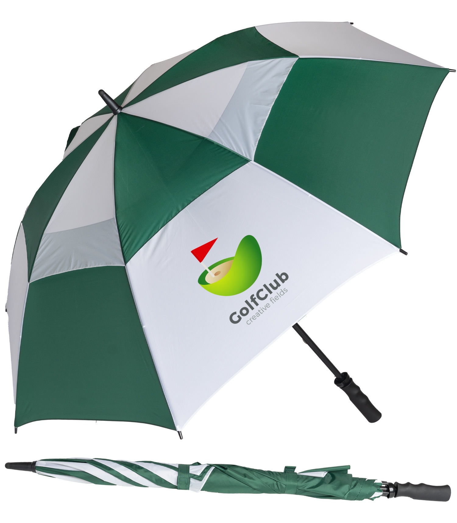 Equip your team with the ultimate golf umbrella for wind and rain. Designeed to withstand wind gusts up to 100 km/h, the MVP umbrella features vented canopy technology. Made of Nylon with 62" arc, fibreglass shaft and Duraflex (TM) fibreglass ribs, a black rubber pistol grip handle and matching nylon sleeve.