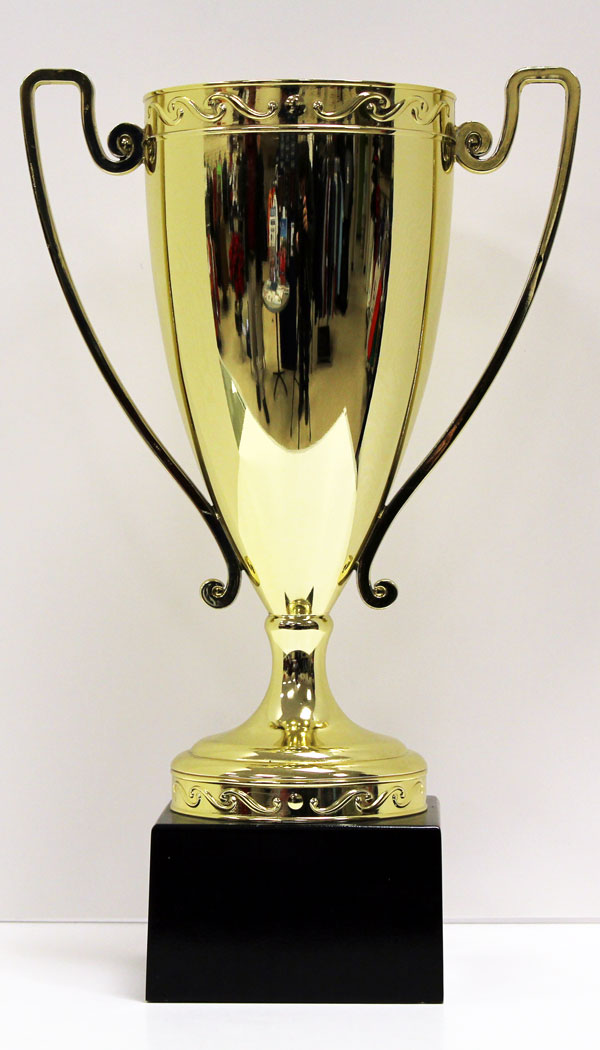 Gold metal cup on silver & gold plastic riser and black plastic base. A Good value high quality trophy. Available in 4 sizes: 12" , 12.75", 14" & 15" Models CMC 331, 332, 333, 334
